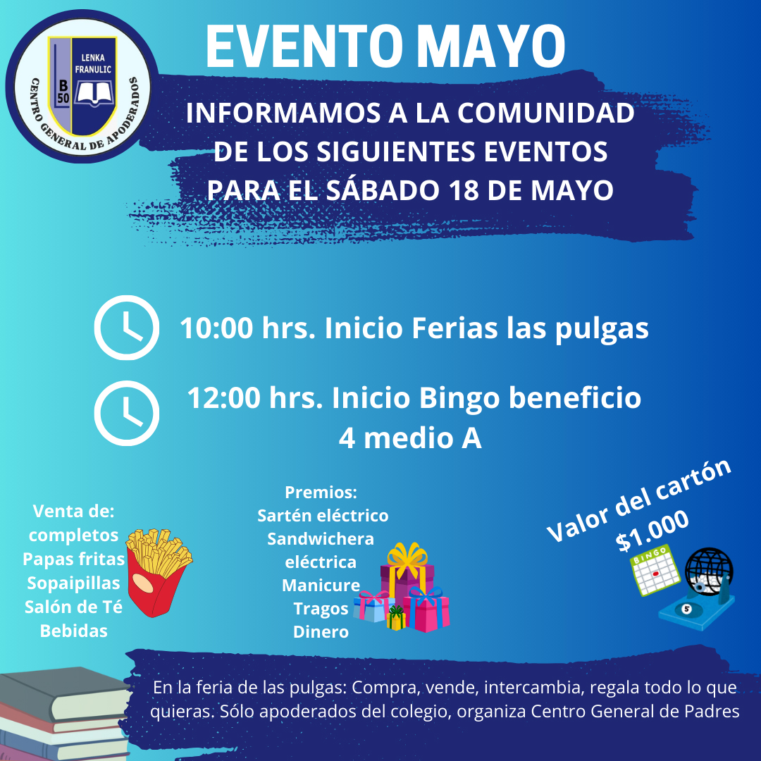 El Centro de Padres y Apoderados (CPA) se complace en invitar a toda la comunidad a participar en nuestros emocionantes eventos programados para el sábado 18 de mayo.