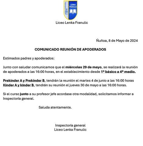 Junto con saludar comunicamos que el Miércoles 29 de Mayo, se realizará la reunión de apoderados a las 16:00 horas, en el establecimiento desde 1º Básico a 4º Medio. Comunicado completo aquí.