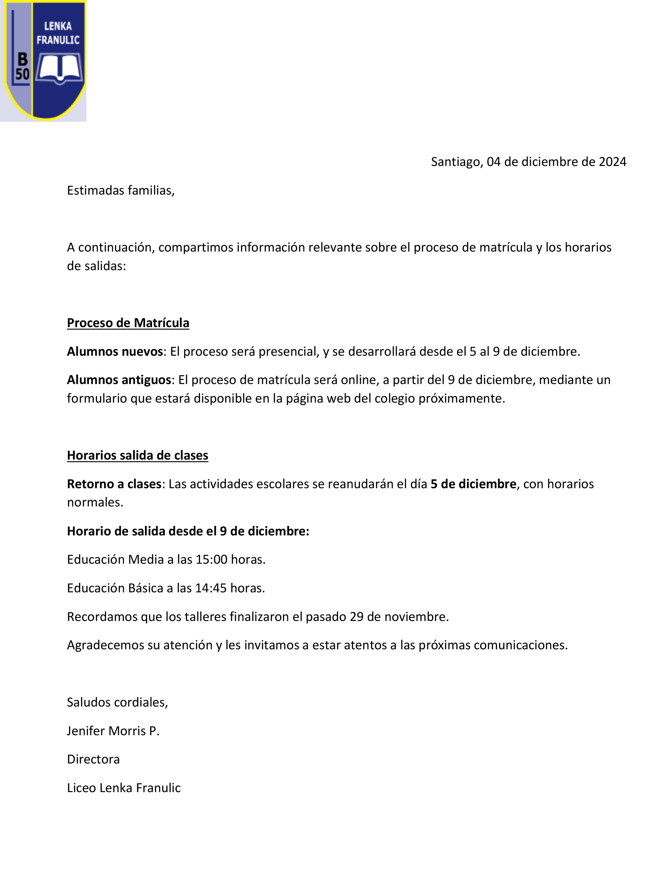 Junto con saludar informamos a ustedes que, los días 2, 3 y 4 de diciembre, el colegio será entregado al DEMRE para la toma de las pruebas PAES, por lo que esos días no habrá clases. El retorno a clases será el día 5 de diciembre en horarios normales.
