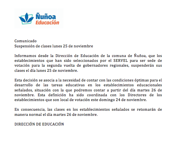La Dirección de Educación de la comuna de Ñuñoa informa que los establecimientos seleccionados por el SERVEL como sedes de votación para la segunda vuelta de gobernadores regionales suspenderán sus clases el lunes 25 de noviembre.