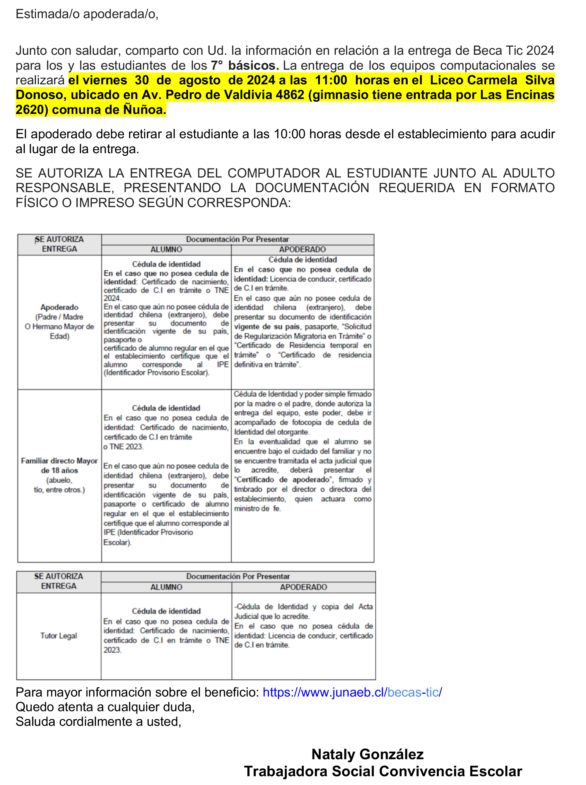 Junto con saludar y atendiendo el avance del proceso de entregas correspondiente al programa Becas Acceso TIC 2024, se envía a ustedes el protocolo de robo de equipos. Recordarles que el turno de nuestro Liceo para el retiro de los equipos de los estudiantes de séptimos básicos es mañana 30 de agosto a las 11:00 horas en el Liceo Carmela Silva Donoso.