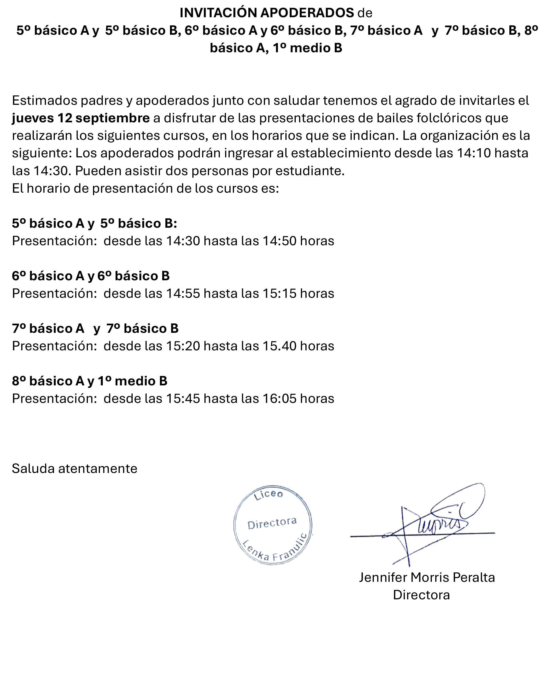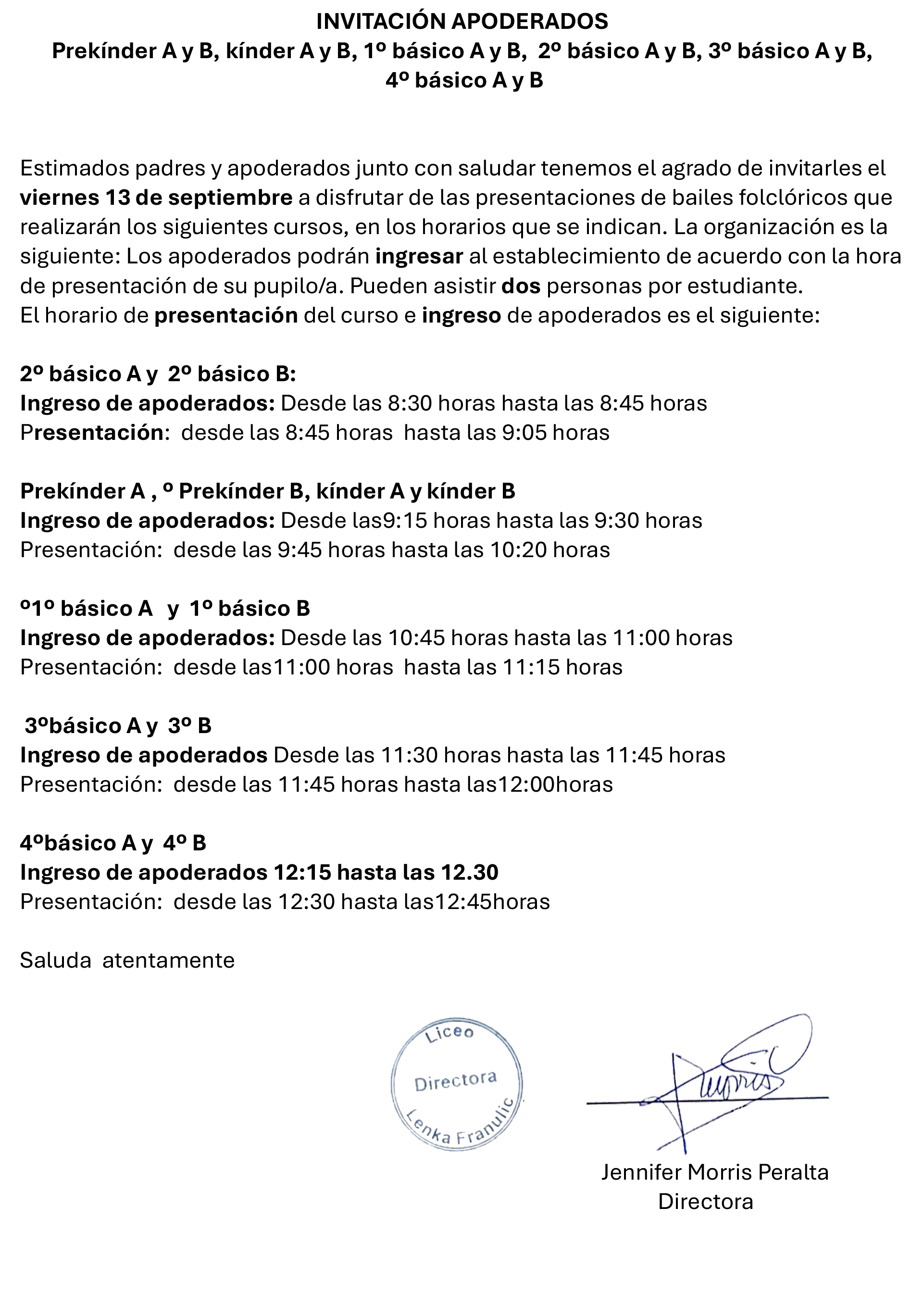 Estimados apoderados, se comunica que el día miércoles 11 de septiembre de 2024 debido a posibles problemas de desplazamiento y seguridad, es que se han modificado los horarios de salida para ese día: