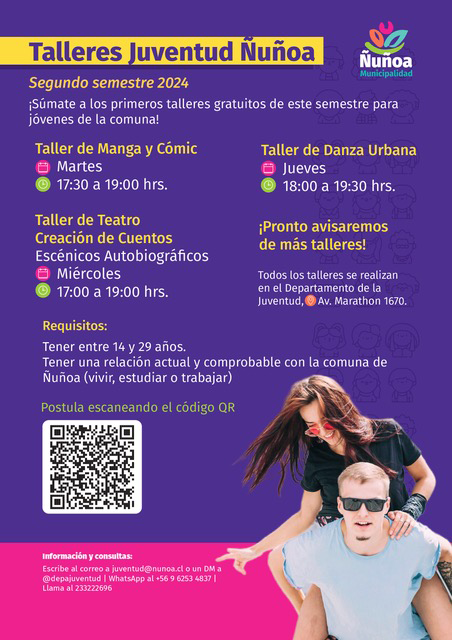 Esperamos que se encuentren muy bien. Les saludamos desde el Departamento de la Juventud de la municipalidad de Ñuñoa para compartir con ustedes la oferta programática de talleres recreativos y culturales del departamento para este segundo semestre. Estos talleres constituyen un primer lanzamiento y esperamos tener más durante los meses de septiembre y octubre.